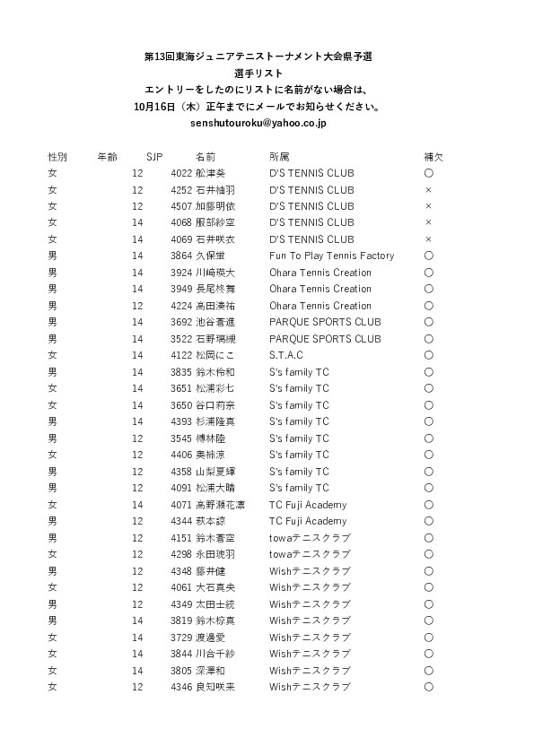2025全日本Jr選抜室内テニス選手権東海予選大会選手選考結果