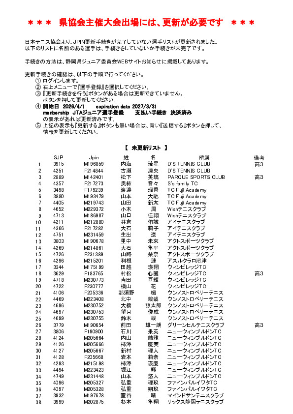 【重要】2026年度 JTAジュニア選手登録・更新手続きについて